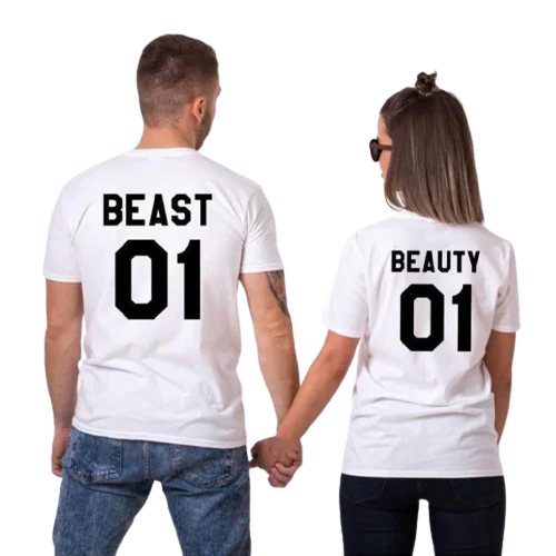 Celebrate your unique love story with these amusing His Beauty, Her Beast Couple T-shirts. Designed to showcase the lighthearted and humorous side of your relationship, these shirts are perfect for couples who love to laugh together.