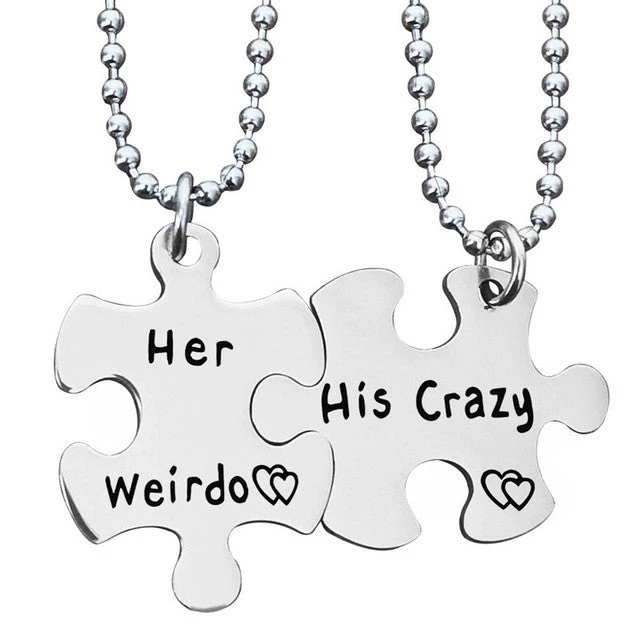 Dive into the fun, eccentric side of romance with our “His Crazy, Her Weirdo” Necklace set. Far from the ordinary, this duo encapsulates the whimsical nature of two souls perfectly mismatched, yet made for each other. Explore the delightful narrative of this distinct tandem.