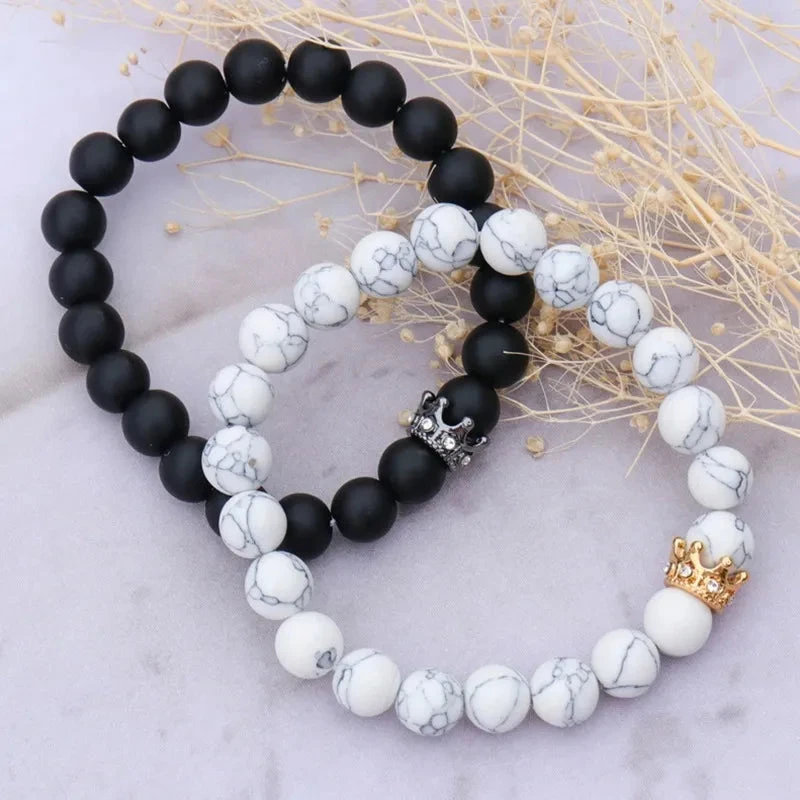 These matching couple bracelets are crafted with particular attention to detail. Made of high-quality materials, they withstand the test of time. The black bracelet is composed of onyx stones, known for their strength and durability. The white bracelet is adorned with mother-of-pearl beads, which glow with a soft, iridescent light.