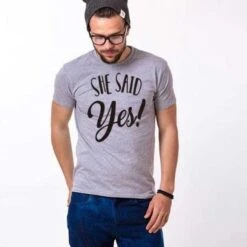 Celebrate a joyful confirmation of love with our Matching couple shirts She said yes. The vibrant “She Said Yes” prints are a joyful affirmation of your bond, making these shirts an essential addition to any engaged couple’s wardrobe. They capture your shared journey to commitment, offering a unique and joyful way to celebrate your love.