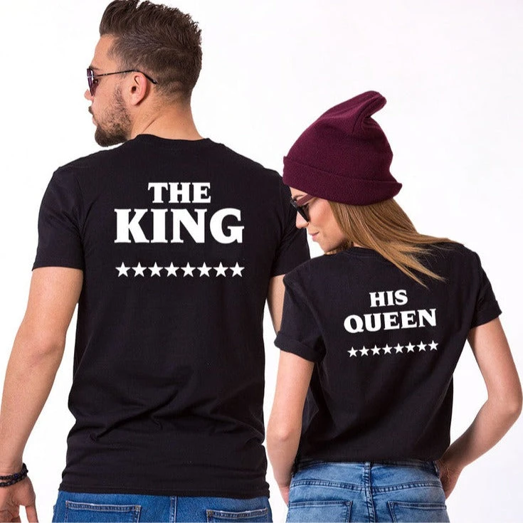Profess your regal romance with our Matching shirts The king and his queen. The imposing “The King” and “His Queen” prints are a royal testament of your bond, making these couple shirts a necessary item for every couple’s attire. They encapsulate your shared love journey, offering a unique and stately way to honour your affection.Â